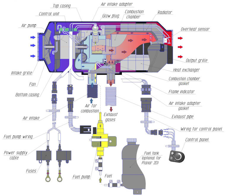 De verwarmingseenheid wordt voorzien van frisse lucht van buiten of goed geventileerde lucht uit de kamer, die via een luchtinlaatpijp naar de verbrandingskamer wordt gebracht. De ontvangen lucht wordt vervolgens gemengd met de brandstof, die via een doseerbrandstofpomp wordt geleverd, en het lucht-brandstofmengsel wordt gevormd. Dit mengsel wordt vervolgens ontstoken door een gloeibougie, die het verbrandingsproces initieert om de warmtewisselaar op te warmen. Lucht wordt vervolgens met een ventilator uit de luchtinlaat getrokken en door warmtewisselaars en de radiatorvinnen geleid. Ten slotte wordt de verwarmde lucht door de warmeluchtuitlaat geduwd.
